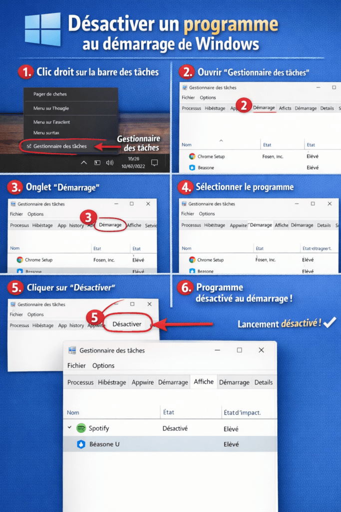 Méthode 1 — Via le Gestionnaire des tâches (la plus courante)